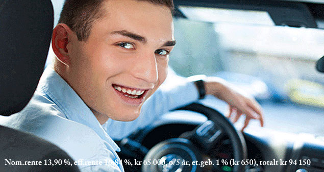 Låneeksempel: Nom.rente 13,90 %, eff.rente 16,84 %, kr 65 000, o/5 år, etabl.geb. 1 % (kr 650), totalt kr 94 150